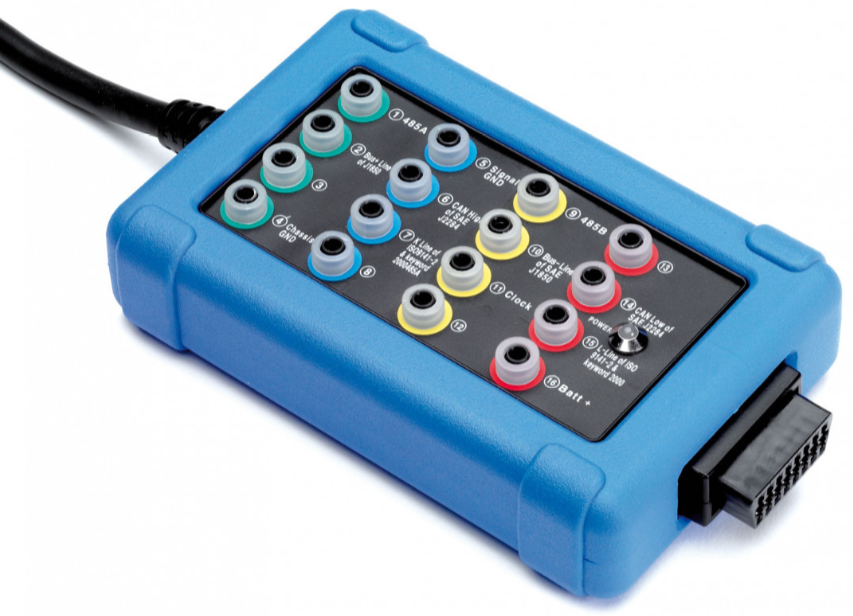 CAN測試盒配有一條2.5米的線纜,所以您可以遠(yuǎn)離診斷連接器在一個(gè)方便的位置工作;另有一個(gè)額外的轉(zhuǎn)接連接頭,可讓您接上示波器的同時(shí)也連接上解碼器。該測試盒由診斷連接器供電,所以不需要電池或電源適配器。