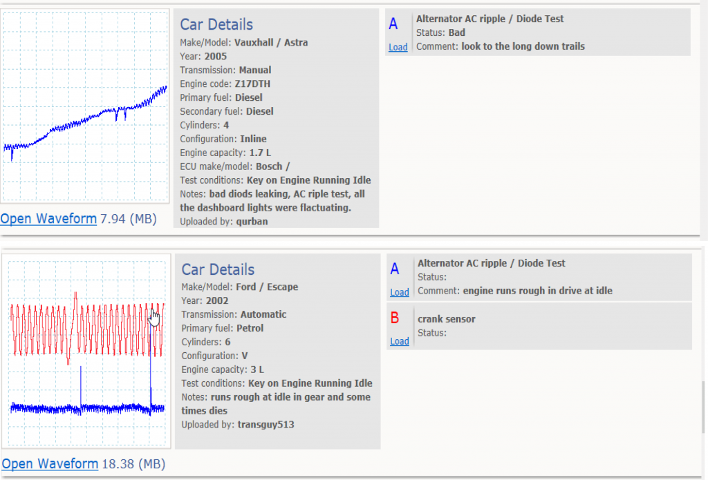●如果發(fā)電機(jī)有一個(gè)二極管故障,波形上會周期性間歇地出現(xiàn)長長的向下的尾巴,并且總的電流輸出的33%會損失掉。三個(gè)相位中的一個(gè)相位果有故障,會顯示與上面類似的波形,但是高度會是它的3或4倍,基線到尖峰電壓超過1伏特。