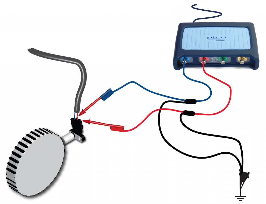 ●連接一條BNC測(cè)試線到示波器B通道,連接一個(gè)后背刺針到測(cè)試線彩色接頭(正極)上,再用刺針背刺感應(yīng)式曲軸傳感器的另一條線,負(fù)極搭鐵。