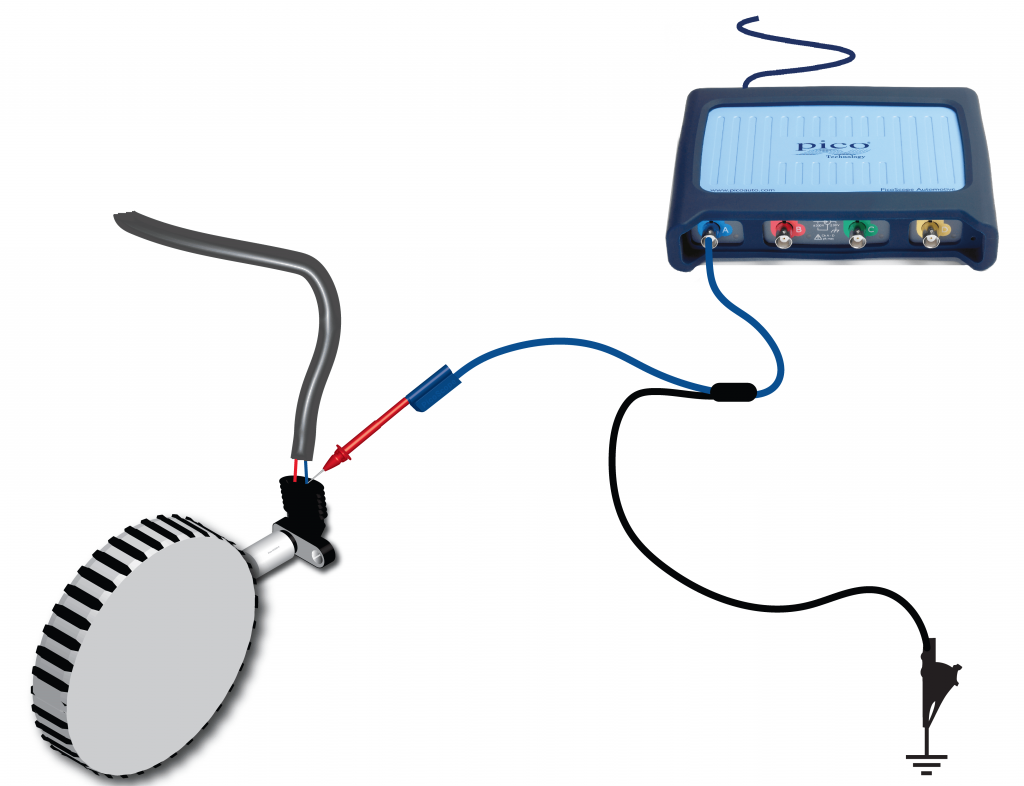 ●連接一條BNC測試線到示波器A通道,連接一個后背刺針到測試線彩色接頭(正極)上,再用刺針背刺感應(yīng)式曲軸傳感器的信號線。