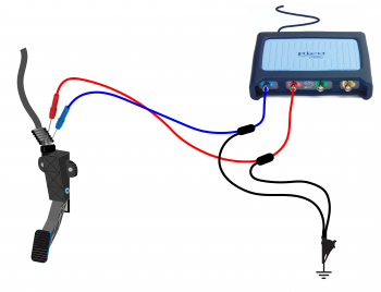 ●連接一條BNC測試線到示波器A通道,連接一個后背刺針到測試線彩色接頭(正極)上。再用刺針背刺加速踏板傳感器插頭里的其中一條電位計連接線,測試線黑色接頭連接到蓄電池負(fù)極搭鐵。