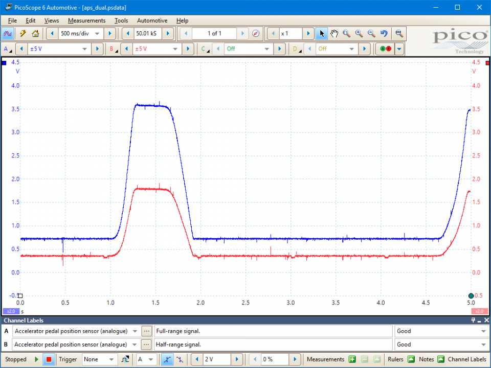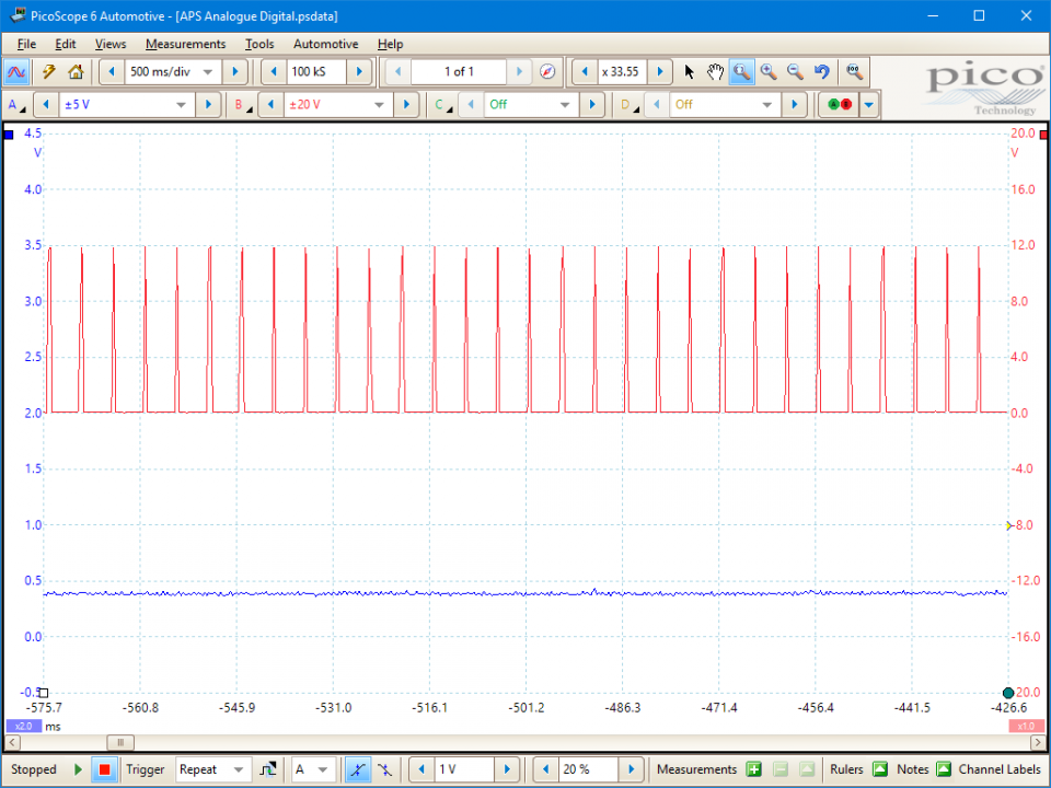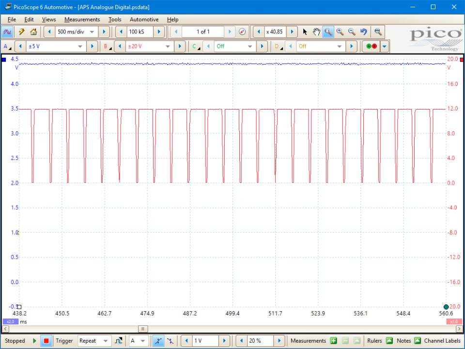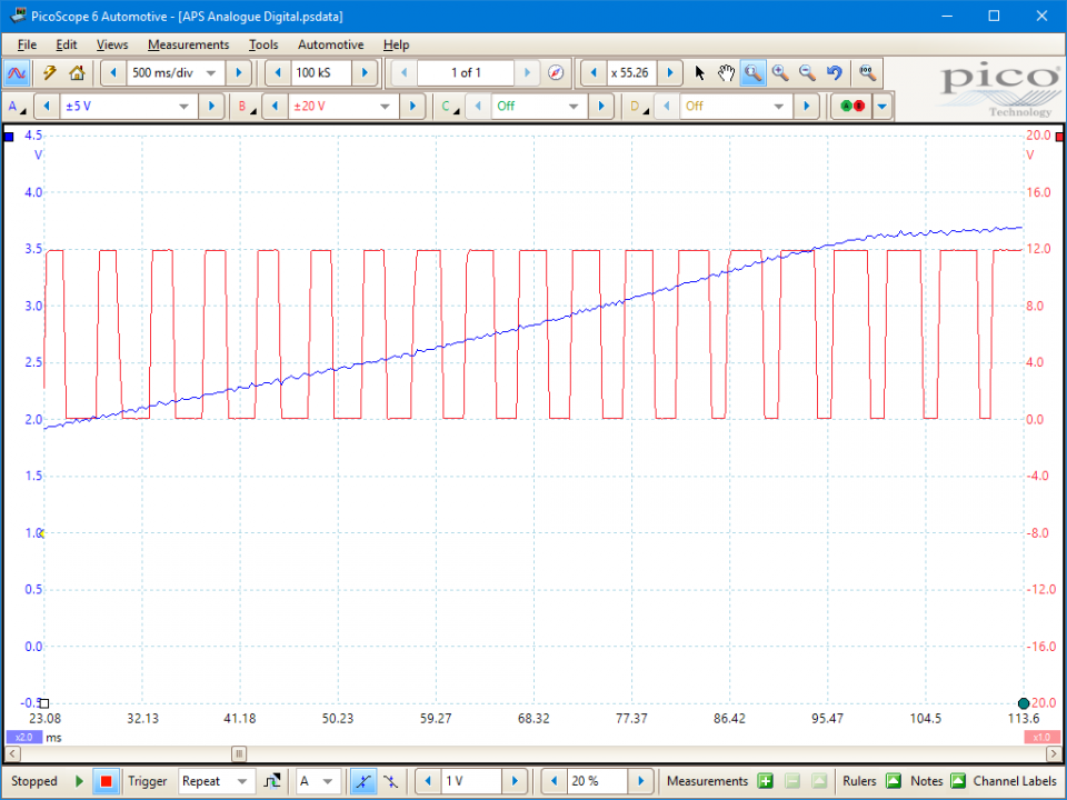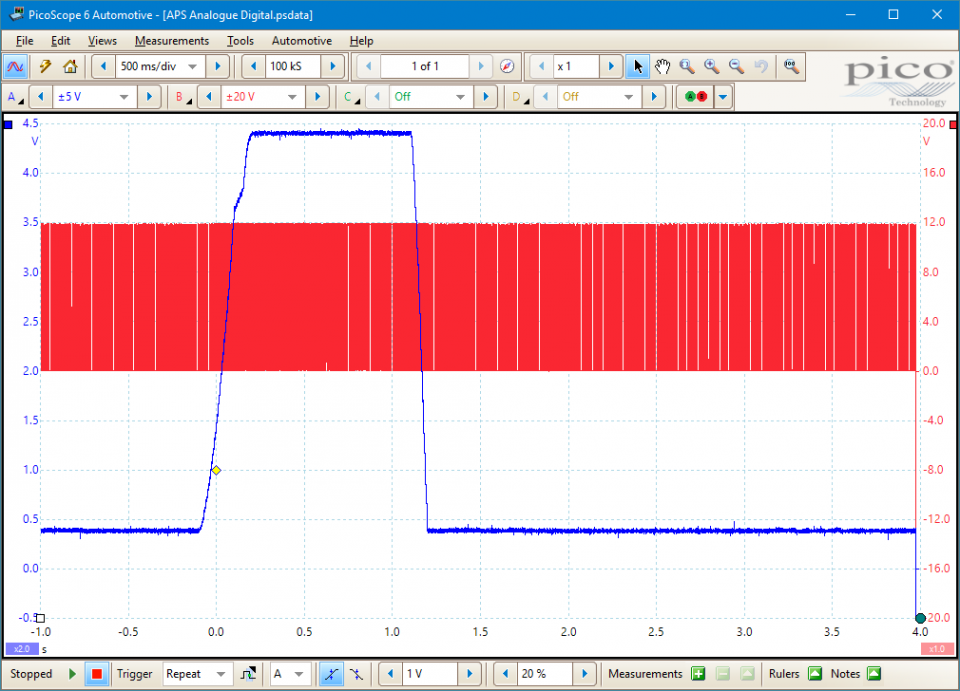 該模擬/數(shù)字APP傳感器產(chǎn)生一個模擬電壓(A通道,藍(lán)色波形和一個數(shù)字輸出(B通道,紅色波形)。模擬電壓與踏板位置成比例關(guān)系,跟前面的波形一樣。數(shù)字電壓是一系列約12伏的可變寬度脈沖。每個脈沖的寬度與當(dāng)時的模擬電壓成比例關(guān)系,如示例波形所示。