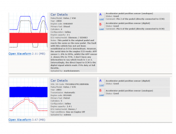 在這個例子里,加速器踏板位置(APP)傳感器是電位計型傳感器。它接收兩個來自動力控制模塊(PCM)的參考電壓,有兩條接地線和兩條信號線(信號線發(fā)送與加速踏板位置相關(guān)的變化電壓給PCM)。這發(fā)送回PCM的信號電壓,不同的汽車會有所不同,但絕不會高于5伏。