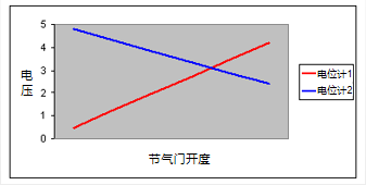 圖3∶電位計1產(chǎn)生一個0.3至4.8伏的信號(圖3里的紅色波形),電位計2產(chǎn)生一個4.8至0.3伏的信號(圖3里的藍(lán)色波形)。當(dāng)加速踏板在0度位置時,電位計1可能輸出0.5伏的信號,電位計2可能輸出4.5伏的信號。