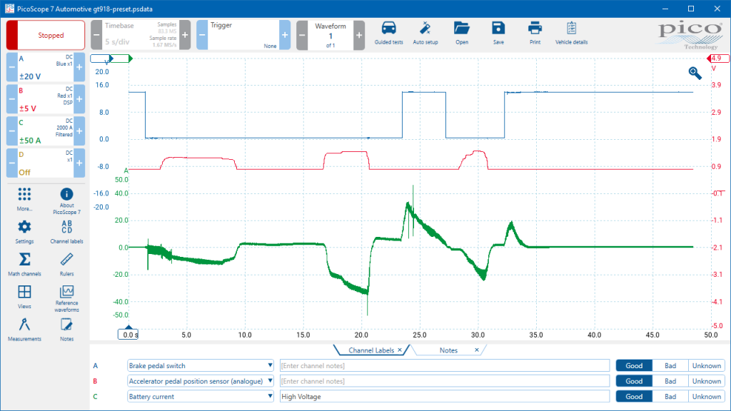 在?波形庫?添加通道的下拉菜單中選擇?Brake pedal switch?或?Accelerator pedal position sensor (analogue)?或?HV inverter DC output current。