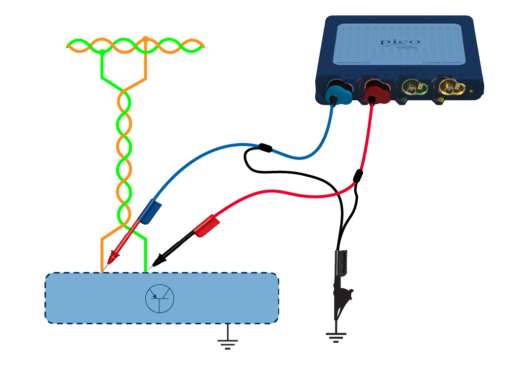 - 連接一條BNC測(cè)試線到?示波器?B通道,連接一個(gè)后背刺針到測(cè)試線彩色接頭(正極)上。再用刺針背刺車輛DLC的針腳 14 ,黑色接頭連接到車輛的蓄電池負(fù)極或底盤良好的接地上搭鐵。
