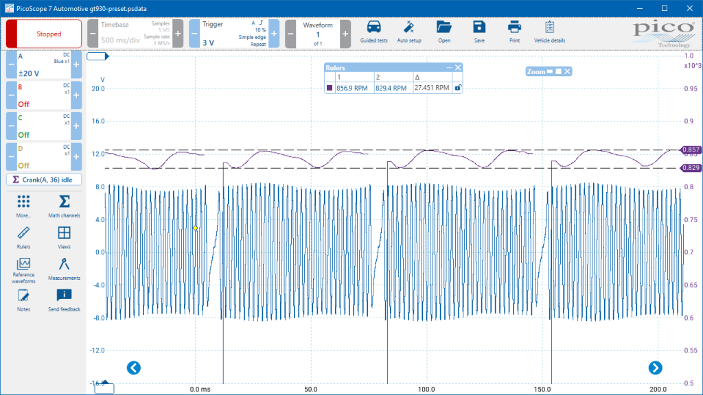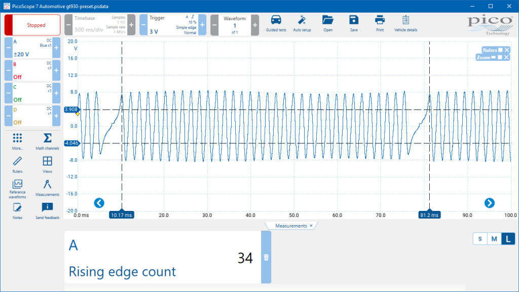 或者,您可以使用?PicoScope軟件?測(cè)量功能里的上升(或下降)沿計(jì)數(shù)進(jìn)行測(cè)量,可以計(jì)算出實(shí)際牙齒數(shù)量。然后您需要添加缺齒數(shù)以補(bǔ)償實(shí)際齒數(shù)。