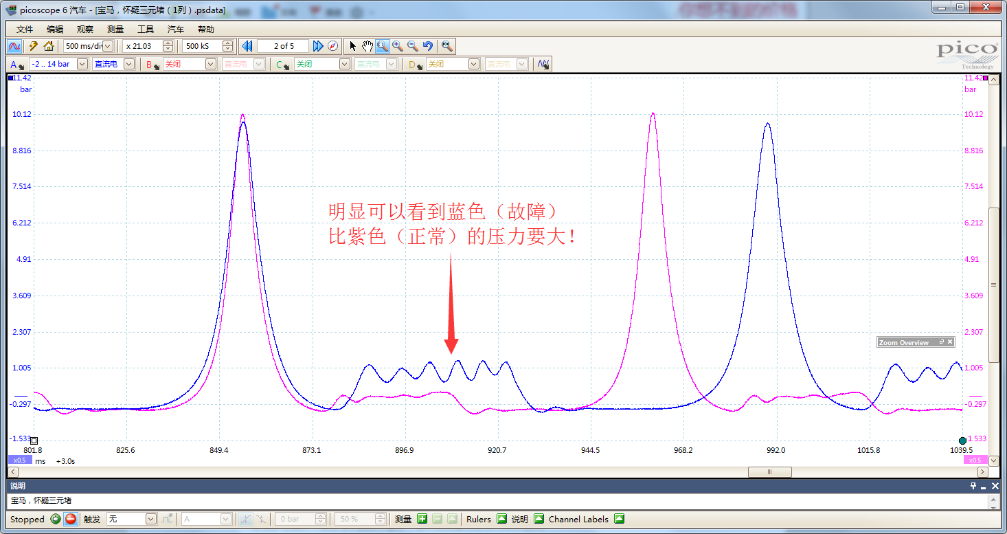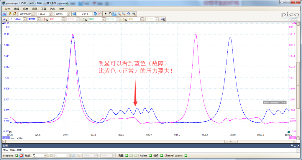 第二個(gè)量程測(cè)量-15至50 psi ( 大約 -1 至 3.45 bar)范圍。該量程特別適用于真空測(cè)試和燃油系統(tǒng)測(cè)試。當(dāng)測(cè)試這些系統(tǒng)時(shí),你會(huì)發(fā)現(xiàn)放大功能特別有用,能夠用真空波形輕松分析氣門工作狀況,或者用燃油波形分析噴油嘴。