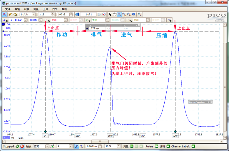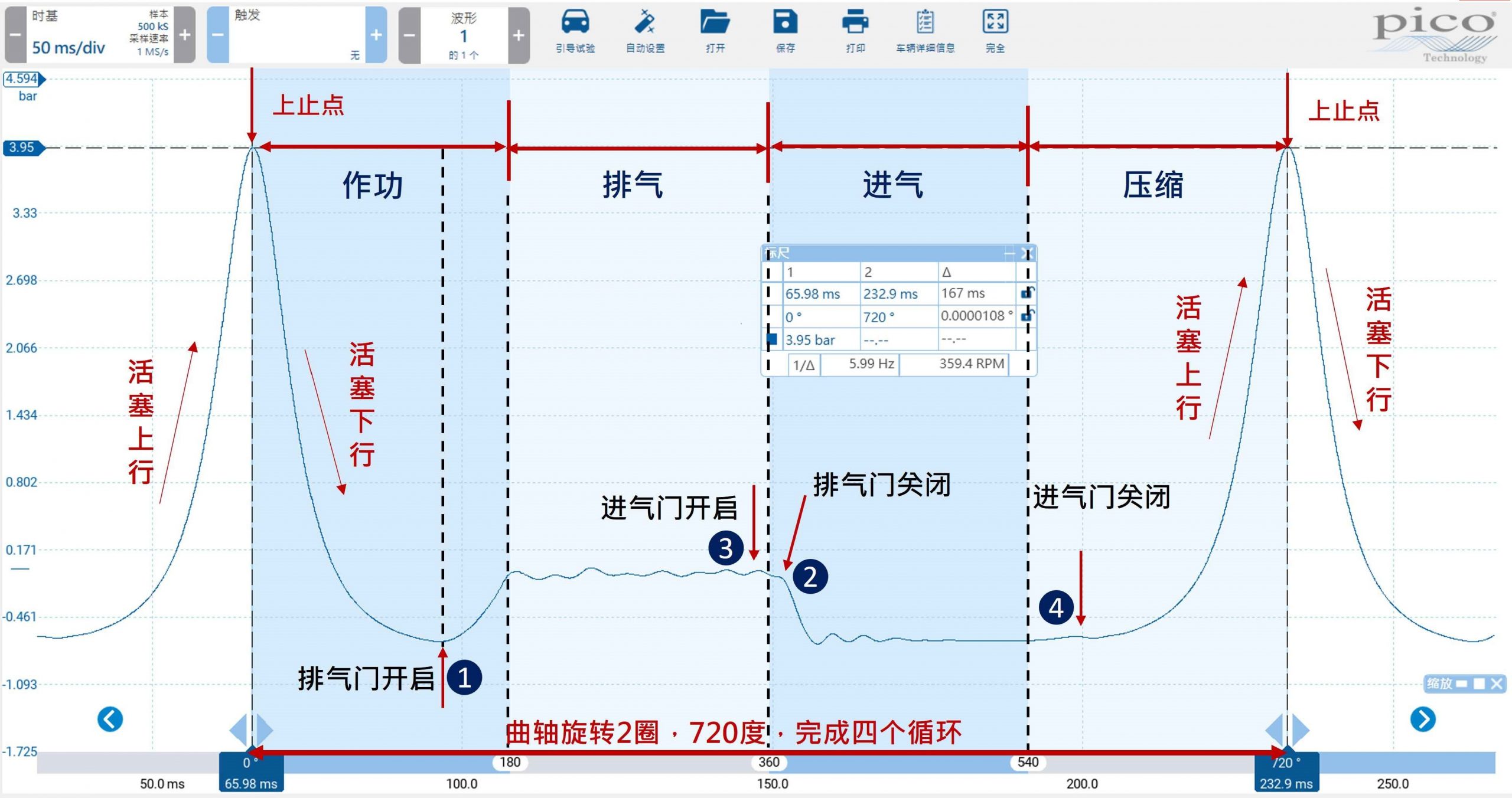 (1)汽缸壓力波形測(cè)試——識(shí)別進(jìn)/排氣門開(kāi)啟關(guān)閉時(shí)刻診斷氣門是否提前開(kāi)啟或卡滯、判斷三元催化器是否堵塞、診斷點(diǎn)火提前角及配氣機(jī)構(gòu)正時(shí)等機(jī)械故障